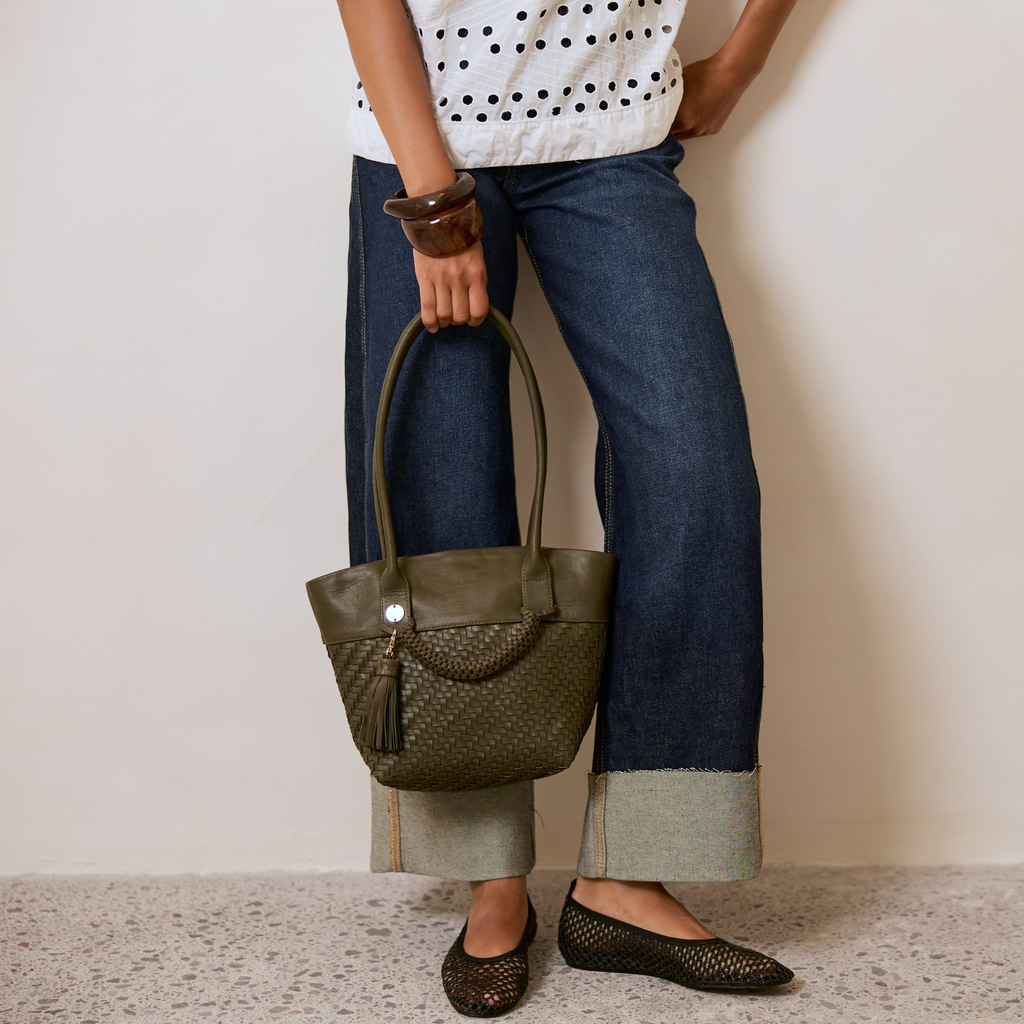 The slim straps rest comfortably on your shoulder, and the woven 'bracelet' feature can be personalised with playful bag charms or left as is for a chic detail.